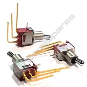 Description: TOGGLE SWITCH SPDT THROUGH HOLE RIGHT ANGLE VERTICAL 20V AC 20V DC STANDARD ROUND NON-ILLUMINATED PC PIN UNTHREADED